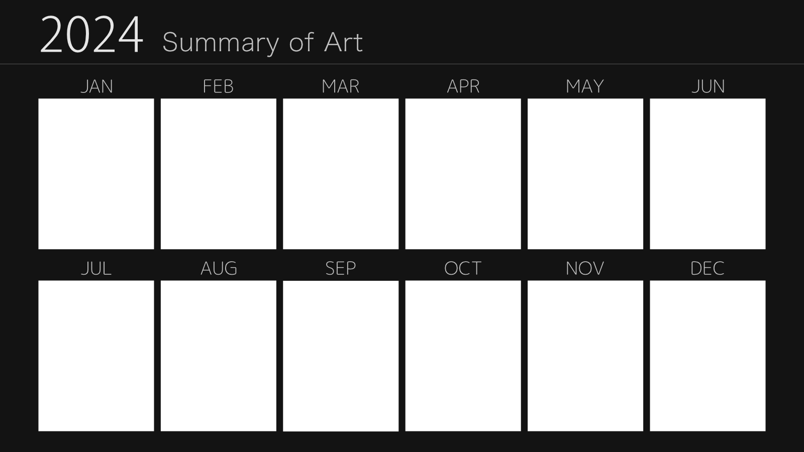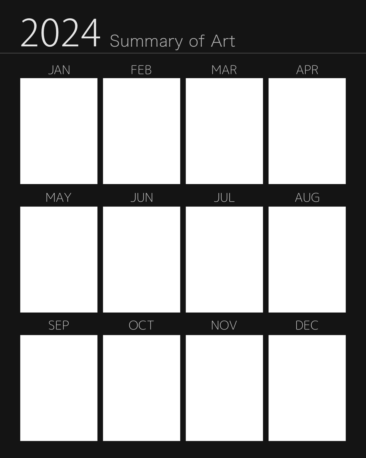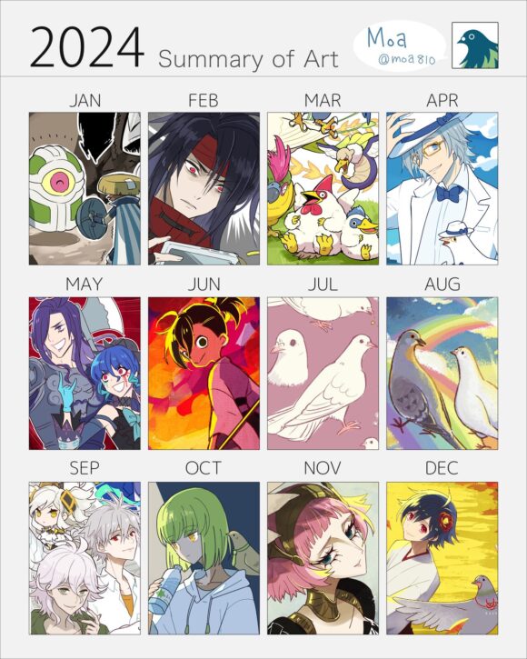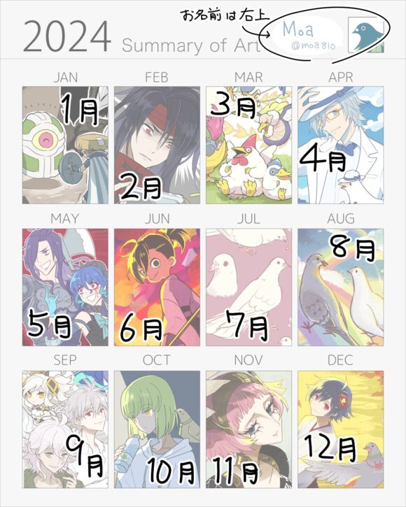 2024.12.08 BLOG moa810 2024年版 イラストまとめテンプレート 毎年恒例のイラストまとめテンプレートを作成しました。今年描いたイラストの中から、各月代表の1枚を選抜してご利用ください。色調変更やアレンジもご自由に。 Art Summary template for 2024.Select your best art from each month. You can edit the design and color if you want. thumb_up12 LIKE送信中です×※コメントは最大500文字、5回まで送信できます送信送信中です送信しました! Bluesky Post